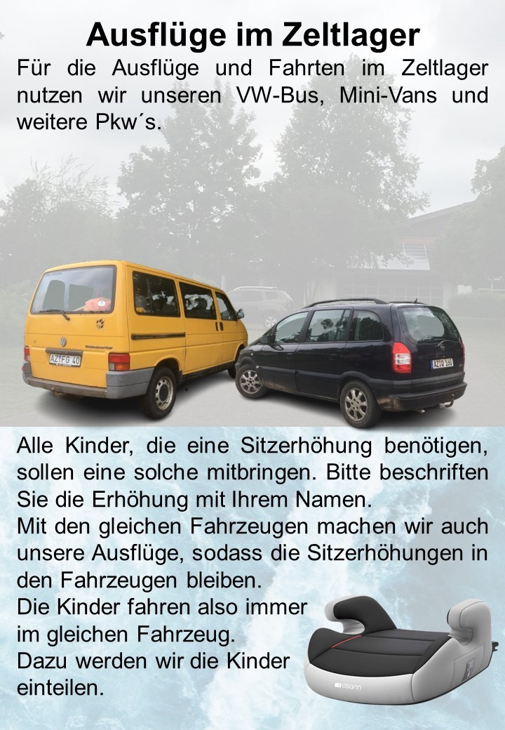 Da der Zeltplatz dieses Jahr so nahe gelegen ist, werden wir die Kinder und Jugendlichen nicht einsammeln und dorthin fahren. Für die An- und Abreise sind die Eltern etc. der Kinder und Jugendlichen verantwortlich.
